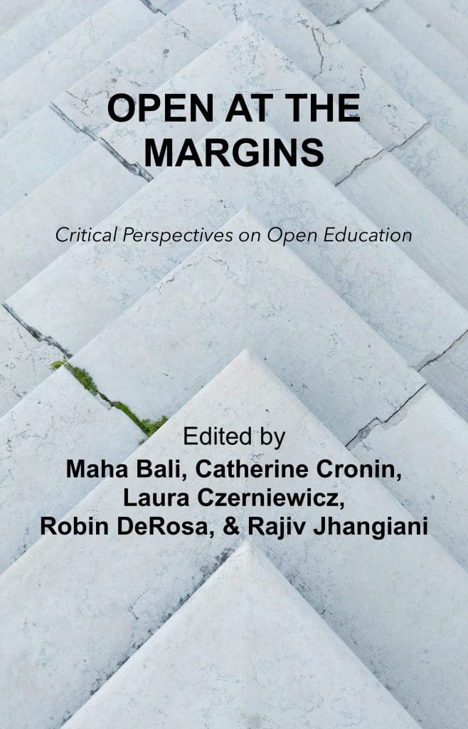 While the open movement is very much engaged in social justice, it is important to challenge the state of the leadership of the movement—that is it so white. That’s why books like Open at the Margins, a collection of essays and stories challenging the status quo of the movement, are integral to the growth and improvement of open education. Open at the Margins features work from a long list of contributors. We recommend starting with “Towards Openness Provocation for #OEB17: How to Create a Non-Inclusive Learning Environment,” a video of a talk by Sherri Spelic in which she highlights the problems of learning environments that ignore, suppress, and oppress marginalized learners.